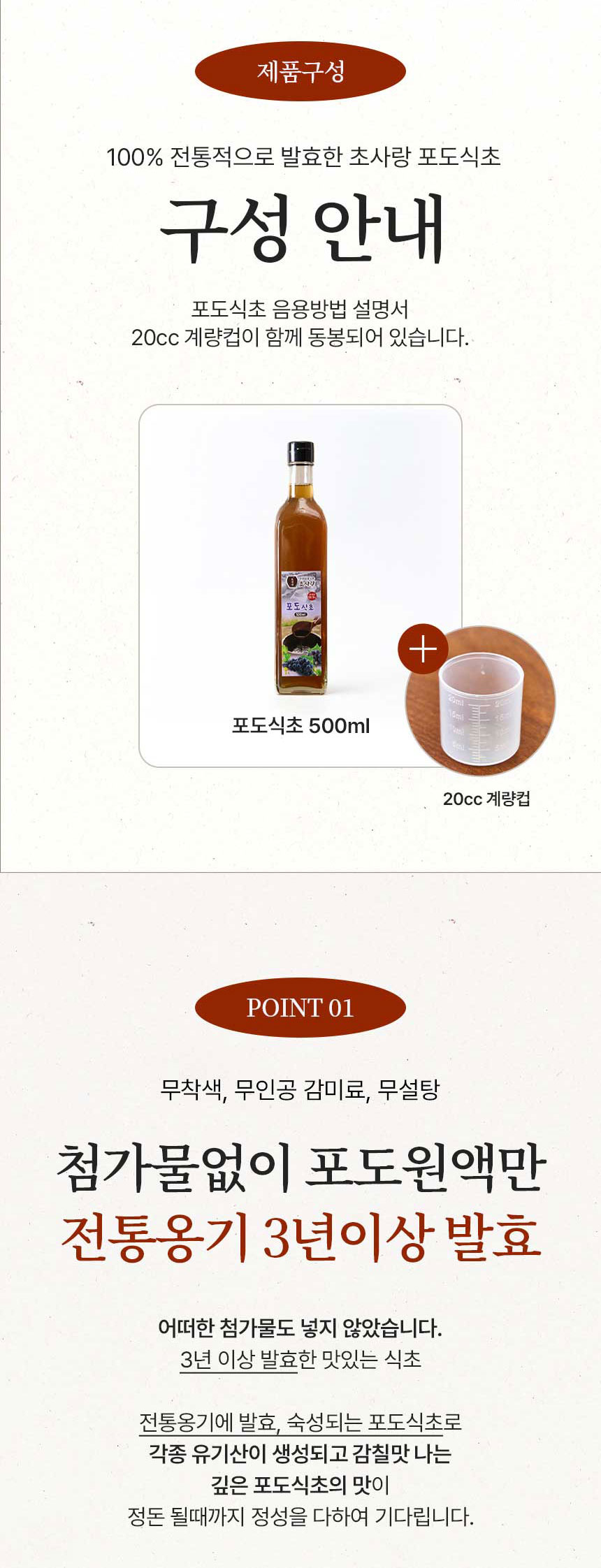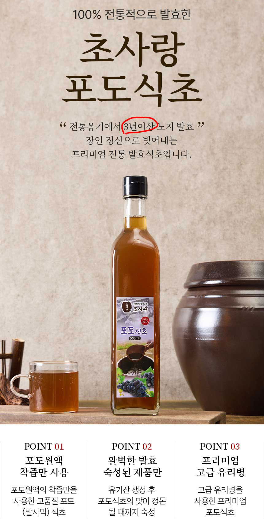 초사랑 포도식초는 주정이나 물을 섞지 않은 100% 포도즙으로 천연옹기에서 자연 그대로 발효, 숙성됩니다.(용량 500ml)