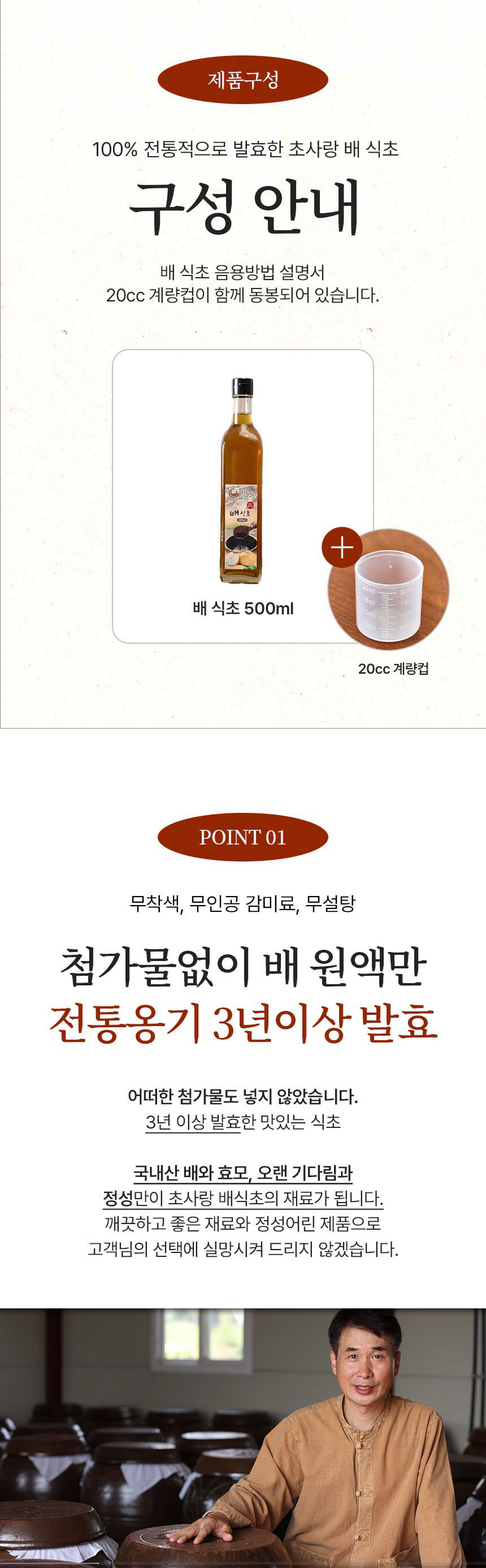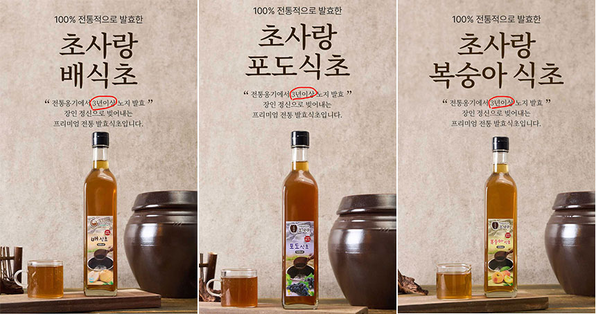 | 포장단위별 내용물의 용량(중량), 수량 | 배식초 500ml, 1병/ 포도식초 500ml, 1병/ 복숭아식초 500ml, 1병 |
